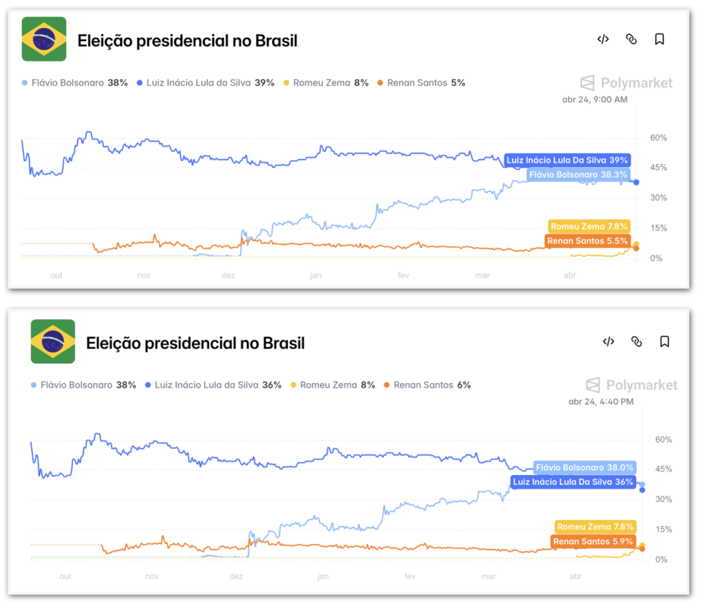Antes da medida, as apostas mostravam um cenário equilibrado entre o presidente Luiz Inácio Lula da Silva (PT), que busca a reeleição, e o senador Flávio Bolsonaro (PL-RJ), apontado como pré-candidato. Até a manhã do dia 24 de abril, Lula concentrava cerca de 39% das apostas, enquanto Flávio aparecia com 38,3%.
