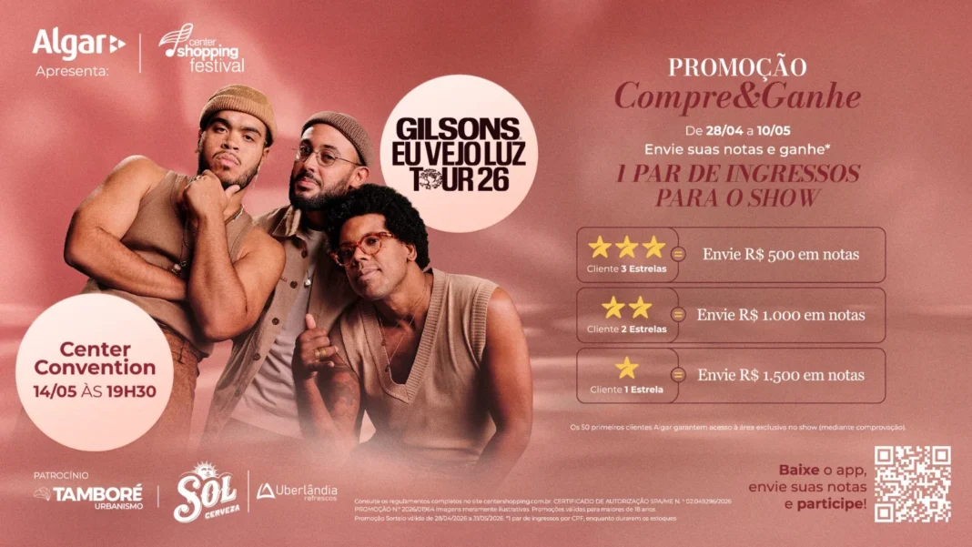 O Center Shopping Uberlândia lançou uma programação do Mês das Mães que reúne apresentação musical e sorteio de um veículo elétrico. A promoção prevê a realização de um show do grupo Os Gilsons e um sorteio de um Geely EX2 0 km.