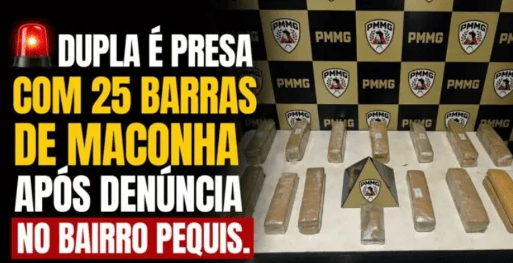 Dois homens foram presos e 25 barras de maconha apreendidas na tarde de quarta-feira (22), por volta das 13h53 (Brasília UTC-3), em uma ação registrada no bairro Pequis, em Uberlândia.