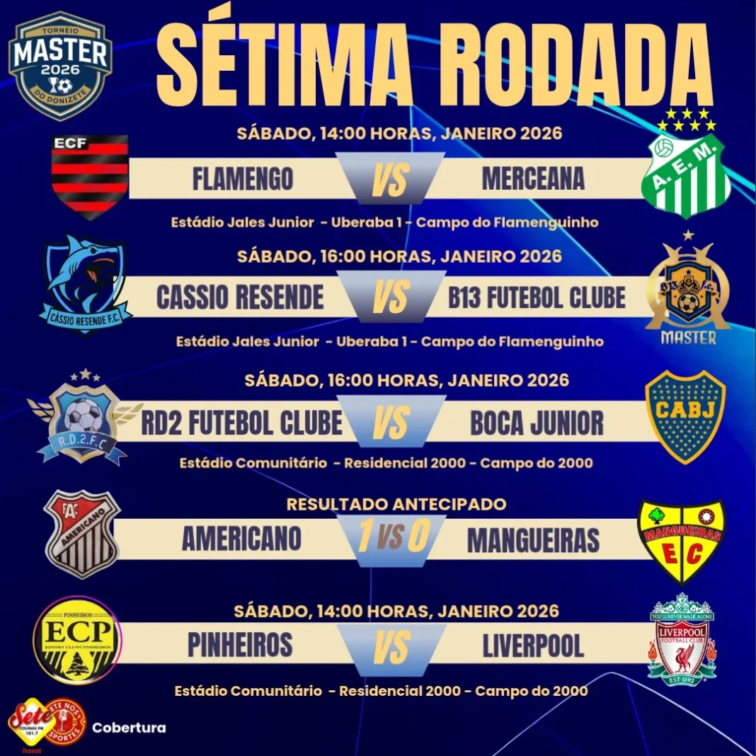 A sétima rodada do Torneio Master do Donizete está marcada para o sábado, 21 de fevereiro de 2026, quando serão realizadas seis partidas. Como jogo adiantado, o Americano já havia vencido o Mangueiras por 1 a 0.